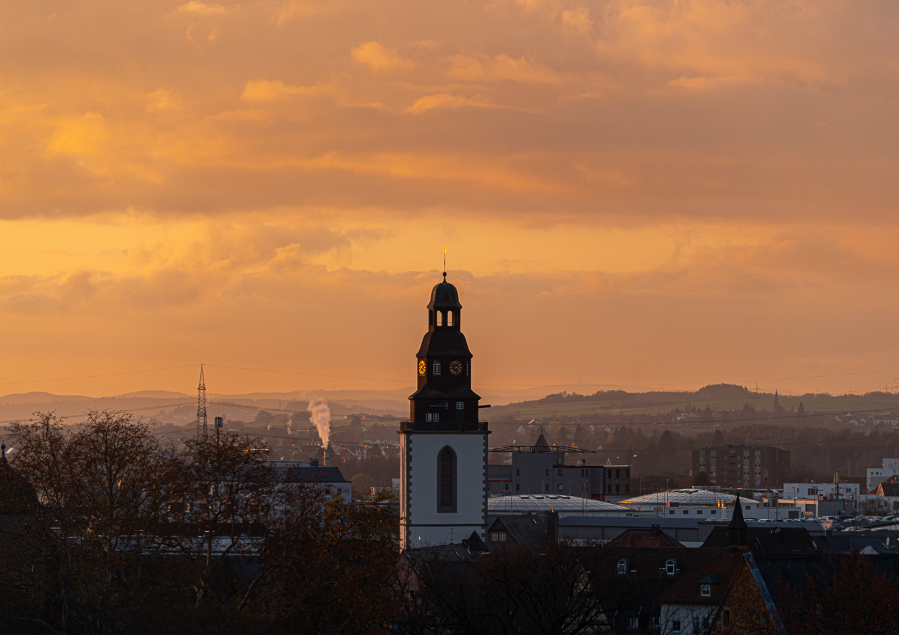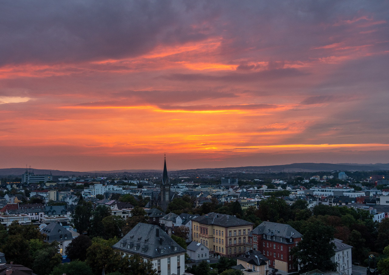 Glühender Himmel ber der Gießener Innenstadt mit Kirchturm, Foto: Holger Fischer