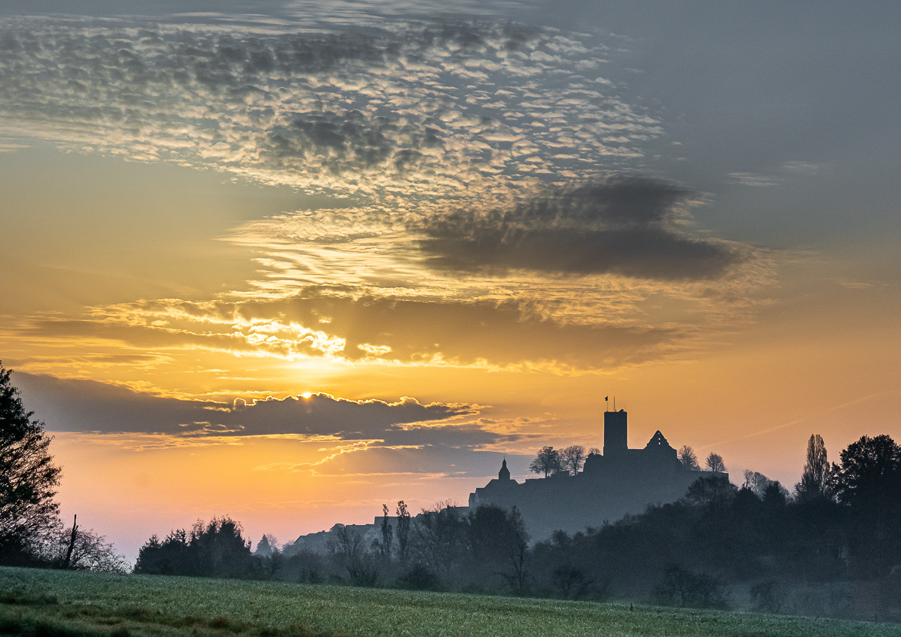 Sonnenaufgang über Burg Gleiberg mit interessanter Wolkenstruktur, Foto: Martin Theiß