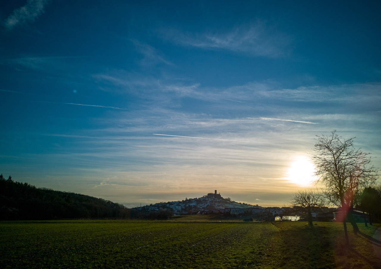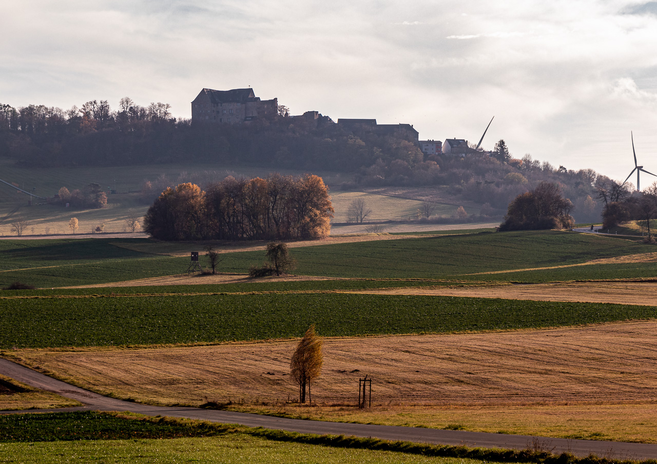 Im November 2020 ist diese Aufnahme von der Burg Hohensolms entstanden. Die tiefstehende Sonne hat eine schöne herbstliche Lichtstimmung über die Felder um Hohensolms geworfen. Foto: Maximilian Kauß