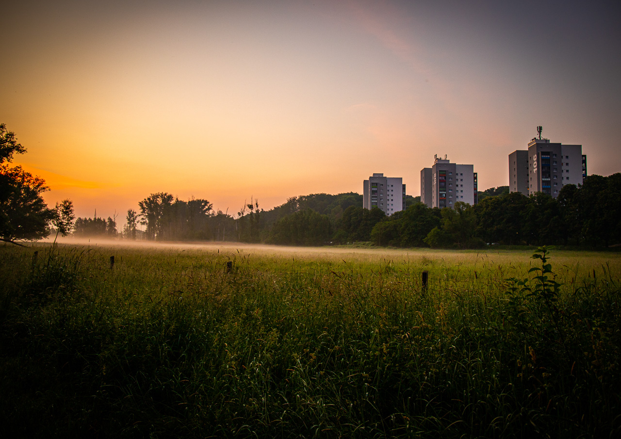 Der Blick von der Wieseckaue auf die Wohnanlage an der Eichgärtenallee bei nebligen Sonnenaufgang. Foto: Sebastian Hartmann