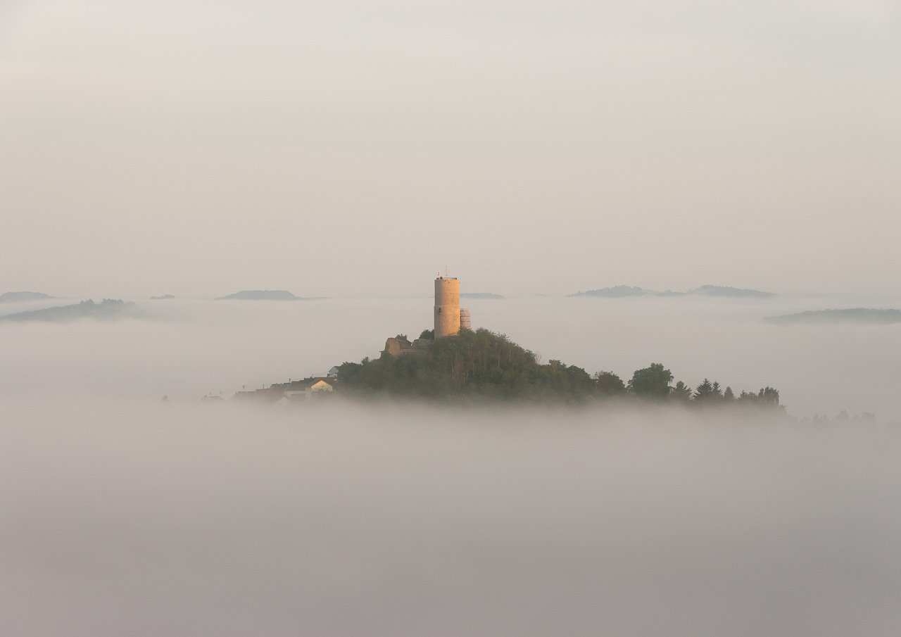 Das Foto zeigt die Burg Gleiberg von der Burg Vetzberg aus gesehen. Ich bin um 05:30 aufgestanden, um die Morgenstimmung und den Aufgang der Sonne zu fotografieren. Durch den Blick in den Sucher bin ich tatsächlich in eine vergangene Epoche eingetaucht, die mich eine geraume Zeit gefangen hielt. Foto: Matthias Dildey