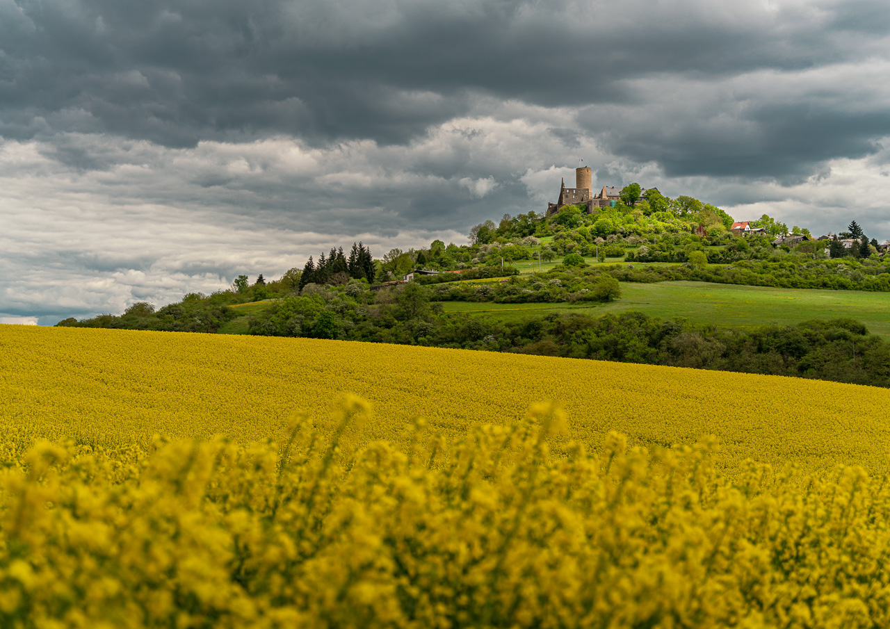 Die Burg Gleiberg mit blühendem Raps im Vordergrund. Foto: Lars Petrick