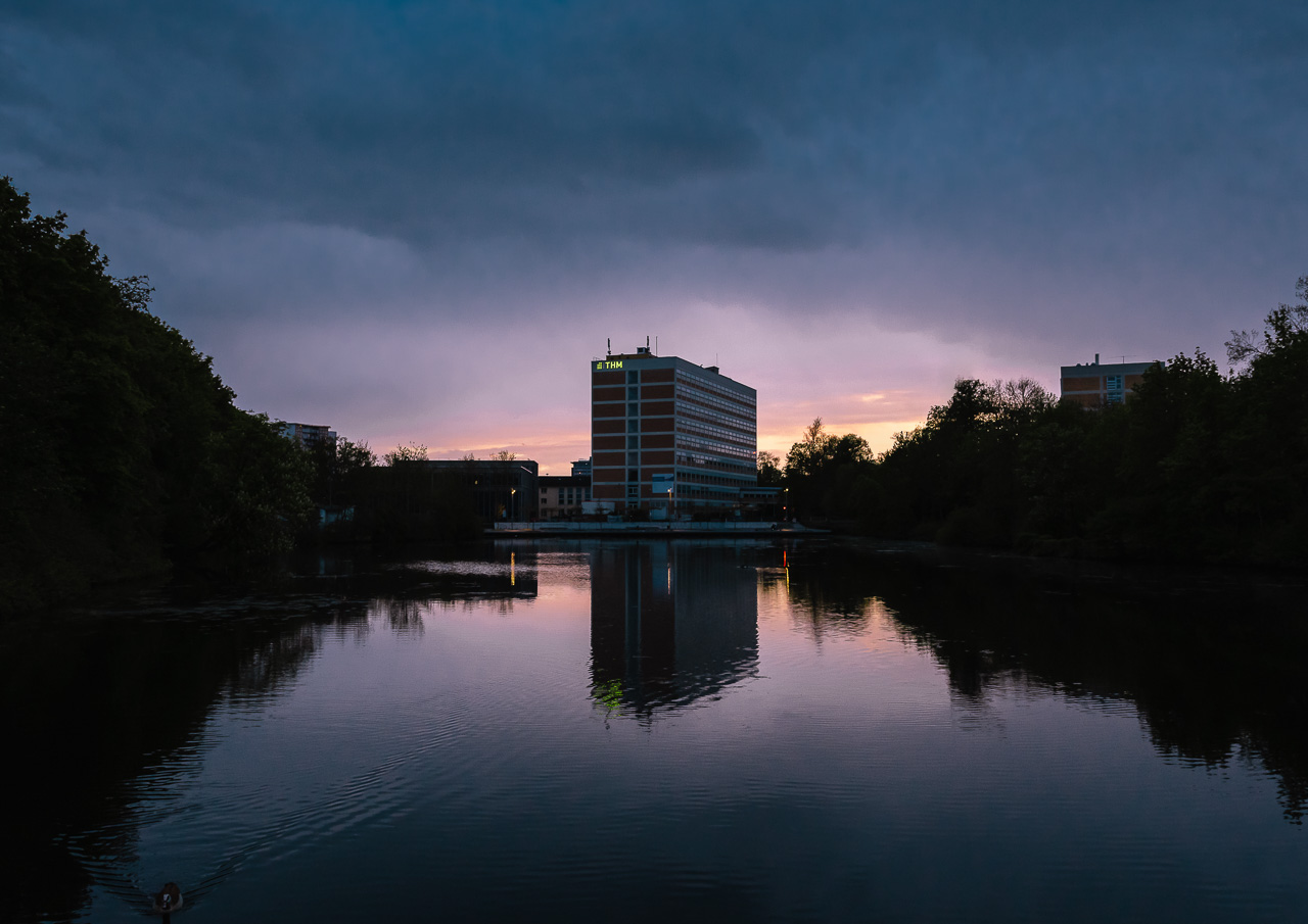 Silhouette der Technischen Hochschule Mittelhessen nach Sonnenuntergang auf der Brücke vom Schwanenteich, Foto: Maximilian Kafanke