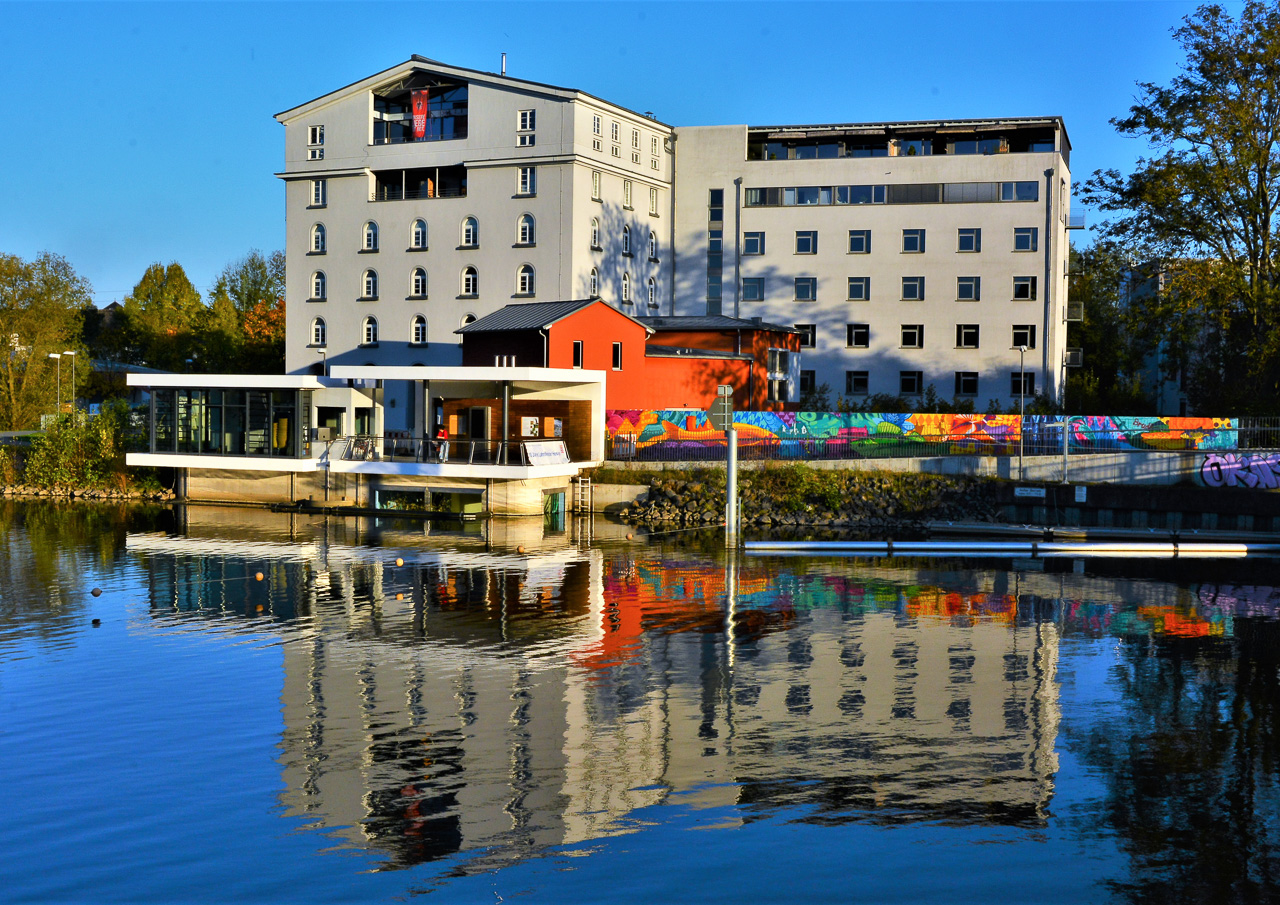 Die THM vom Schwanenteich aus fotografiert bei faszinierendem Licht und toller Spiegelung. Foto: Volker Giel