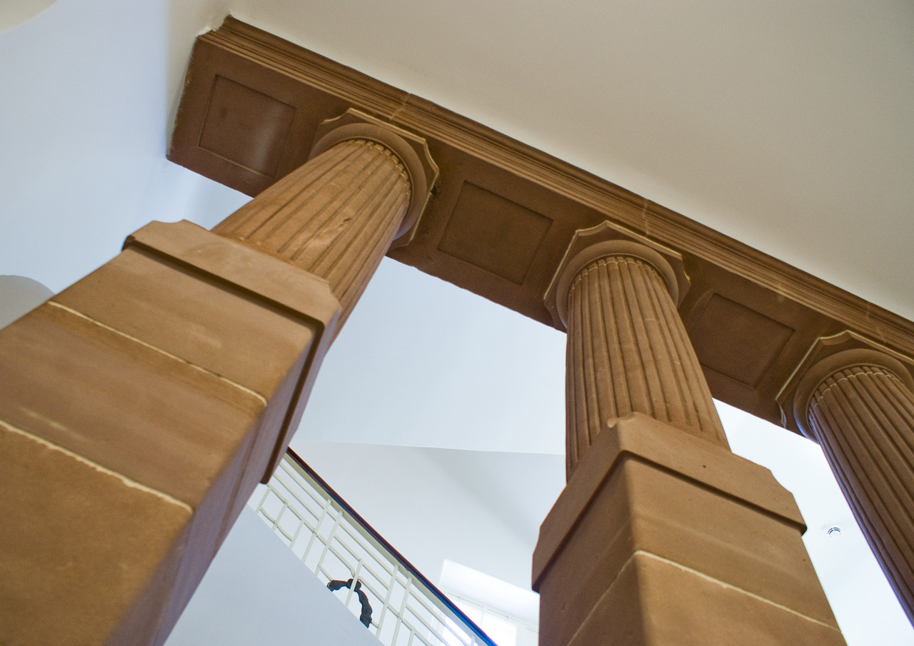 Säulen in der „Alten Chirurgie“. Dieses Gebäude gehört zu den Kliniksbauten aus dem 19. Jahrhundert. Heute werden dort angehende Mediziner ausgebildet. Das Gebäude wurde beispielhaft modernisiert. Der Blick zur Decke in diesem Treppenhaus dieses Juwels der Architektur ist sehr attraktiv. Foto: Peter Eschke