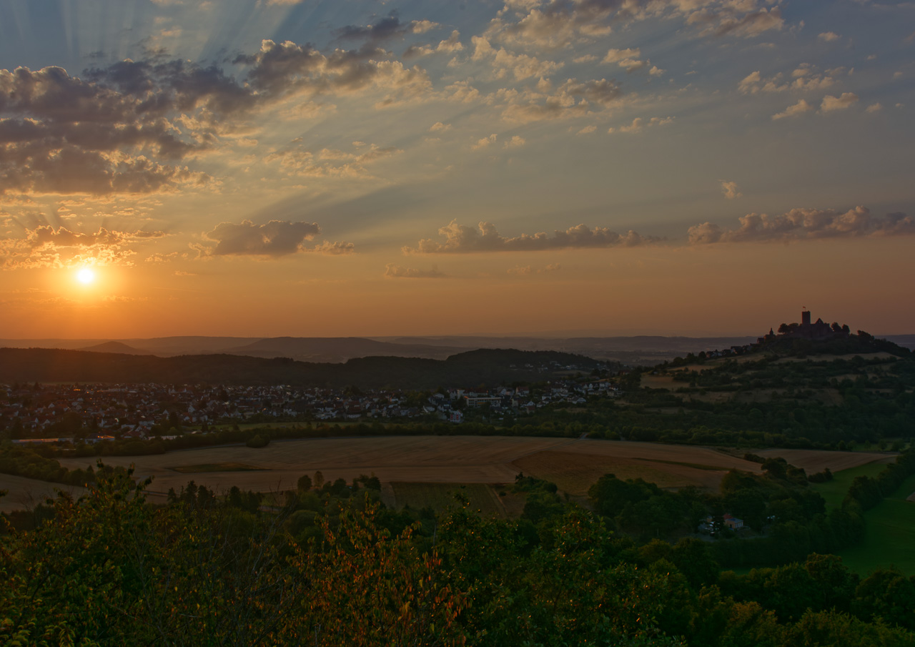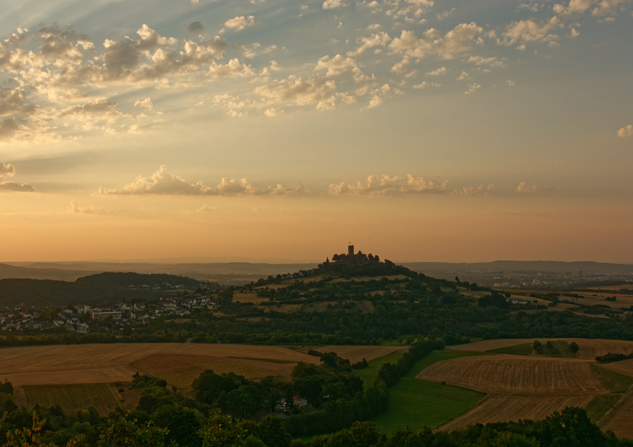 Die Burg Gleiberg, betrachtet vom Wald nahe Fellingshausen. Die letzten Sonnenstrahlen haben diese wunderschöne Abendstimmung auf den Wolkenhimmel gezaubert. Foto: Felix Hees