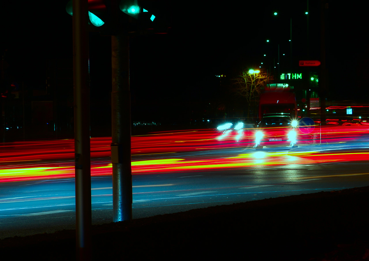 Diese Langzeitbelichtung einer Straße, ist in Mitten von Gießen entstanden. Der genaue Ort beläuft sich auf die Kreuzung „Berliner Platz“, aufgenommen in Richtung THM. Foto: Sebastian Jost