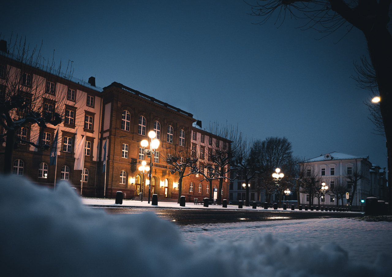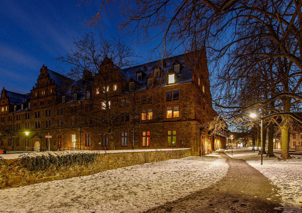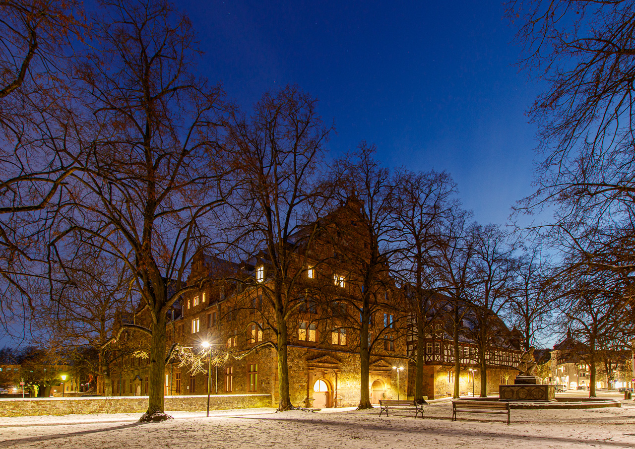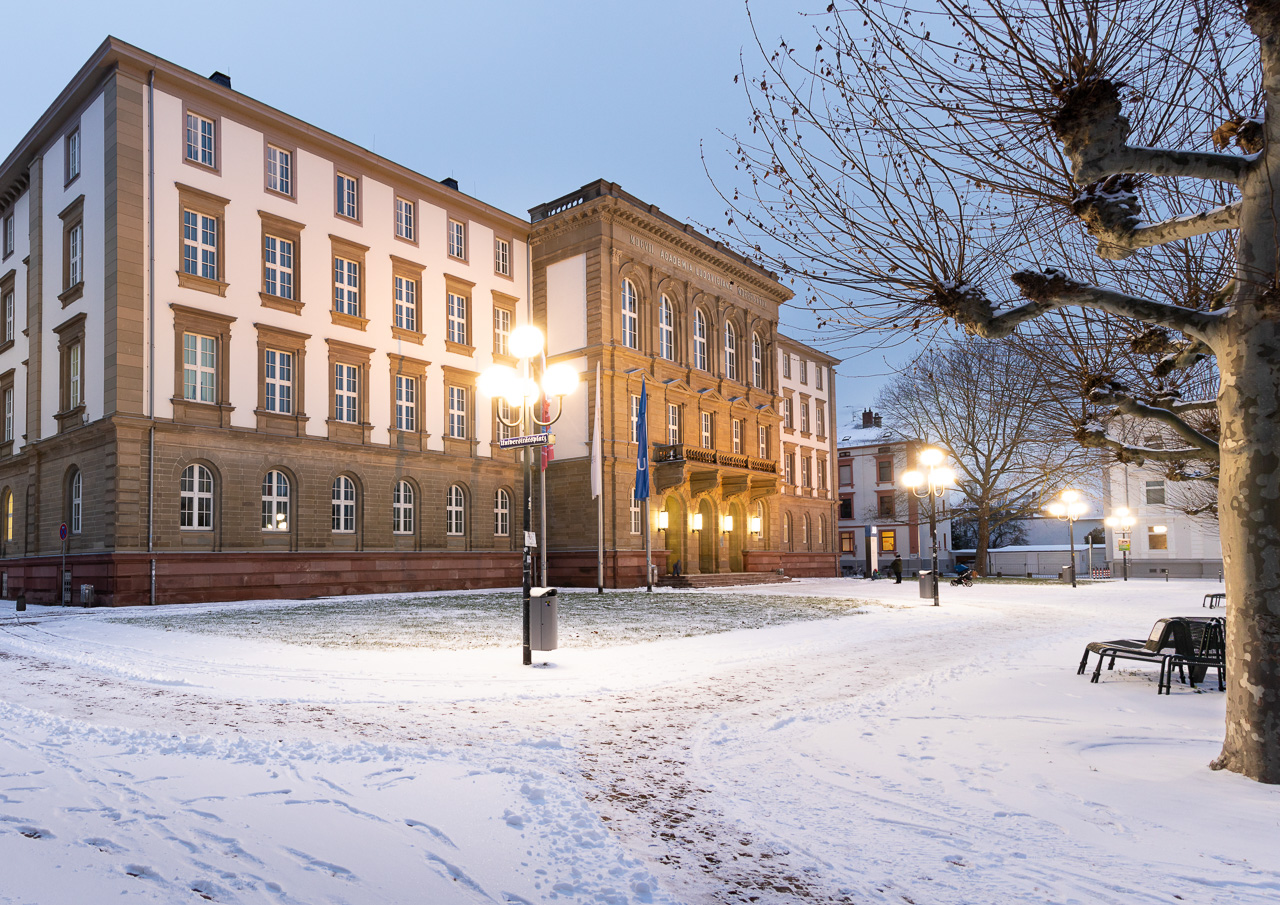 Unihauptgebäude im Winter zur blauen Stunde, Foto: Ina Batz