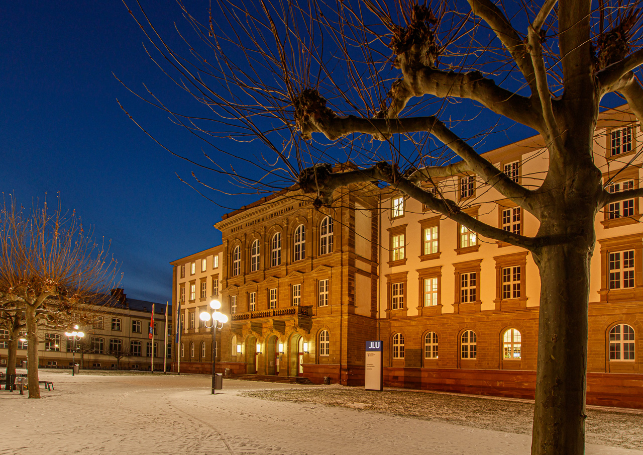 Der letzte Winter brachte seit längerer Zeit nochmal Schnee – beim morgendlichen Spaziergang an der frischen Luft ist dieses Bild vor dem JLU Hauptgebäude entstanden. Foto: Sebastian Spies