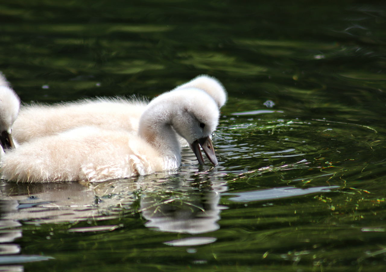 Dieses Bild zeigt junge Schwäne auf dem Schwanenteich. Zu diesem Zeitpunkt, waren sie gerade erst ein paar Tage jung und daher noch mit einem sehr schön, hellen Federkleid zu bewundern. Foto: Sebastian Jost