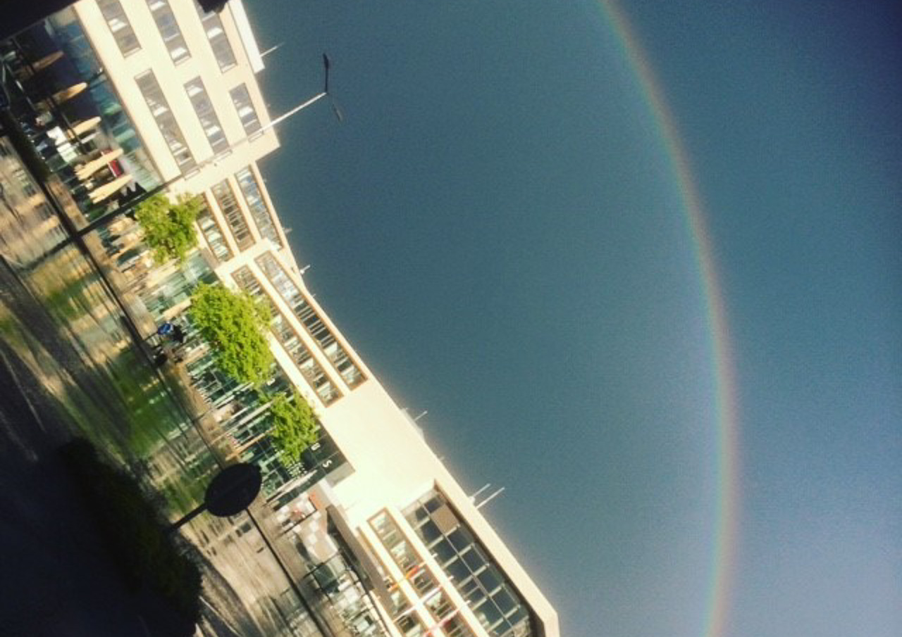 Der Blick über mein geliebte Nordstadt, Gleiberg und den Fernsehturm alles von meinem Balkon aus. Aber das Beste ist der Regenbogen drüber. Foto: Amanda Russell